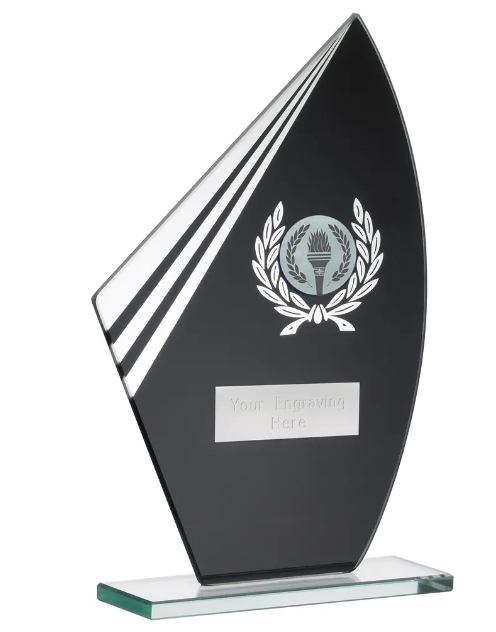 Dual curve black and silver laurel wreath glass award measuring 16.5cm. Features a black curved shaped glass and a marble textured glass with a laurel wreath, mounted to a glass base.
